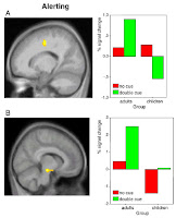 Los resultados mostraron que en todos los participantes se activó la misma región, pero niños y adultos presentaron diferentes patrones de activación. Al estar alerta, se activó principalmente una región de la corteza frontal llamado giro del cíngulo frontal derecho (figura 2A) y una estructura subcortical denominada tallo cerebral (figura 2B), el cual es la continuación de las fibras que conforman la médula espinal. Las discrepancias en el tamaño de las barras corresponden a diferencias en la intensidad de señal provocada por los diferentes cambios metabólicos (oxigenación) neuronales de niños y adultos al resolver la tarea. Las barras rojas corresponden a la activación neuronal al estar alertas a las imágenes sin pista y las barras verdes a las imágenes de alerta con pista (doble asterisco). Los autores sugieren que las diferencias observadas se deben a diferentes mecanismos de procesamiento entre niños y adultos.